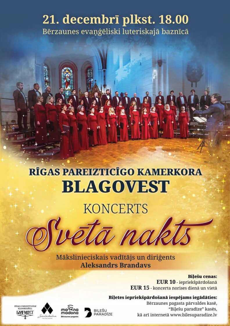 21. decembrī, Ziemassvētku priekšvakarā, uz muzikāli augstvērtīgu, burvīga skanējuma piepildītu koncertu Bērzaunes ev .luteriskajā baznīcā ielūdz Rīgas pareizticīgo kamerkoris “Blagovest”.