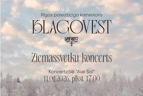 11. janvārī pl. 17.00 Koncertzālē “Ave Sol” Rīgas pareizticīgo kamerkoris “Blagovest” aicina uz pareizticīgo Ziemassvētku koncertu - garīgu muzikālu notikumu, kas ļaus iejusties Kristus Piedzimšanas svētku gaišajā noskaņā.